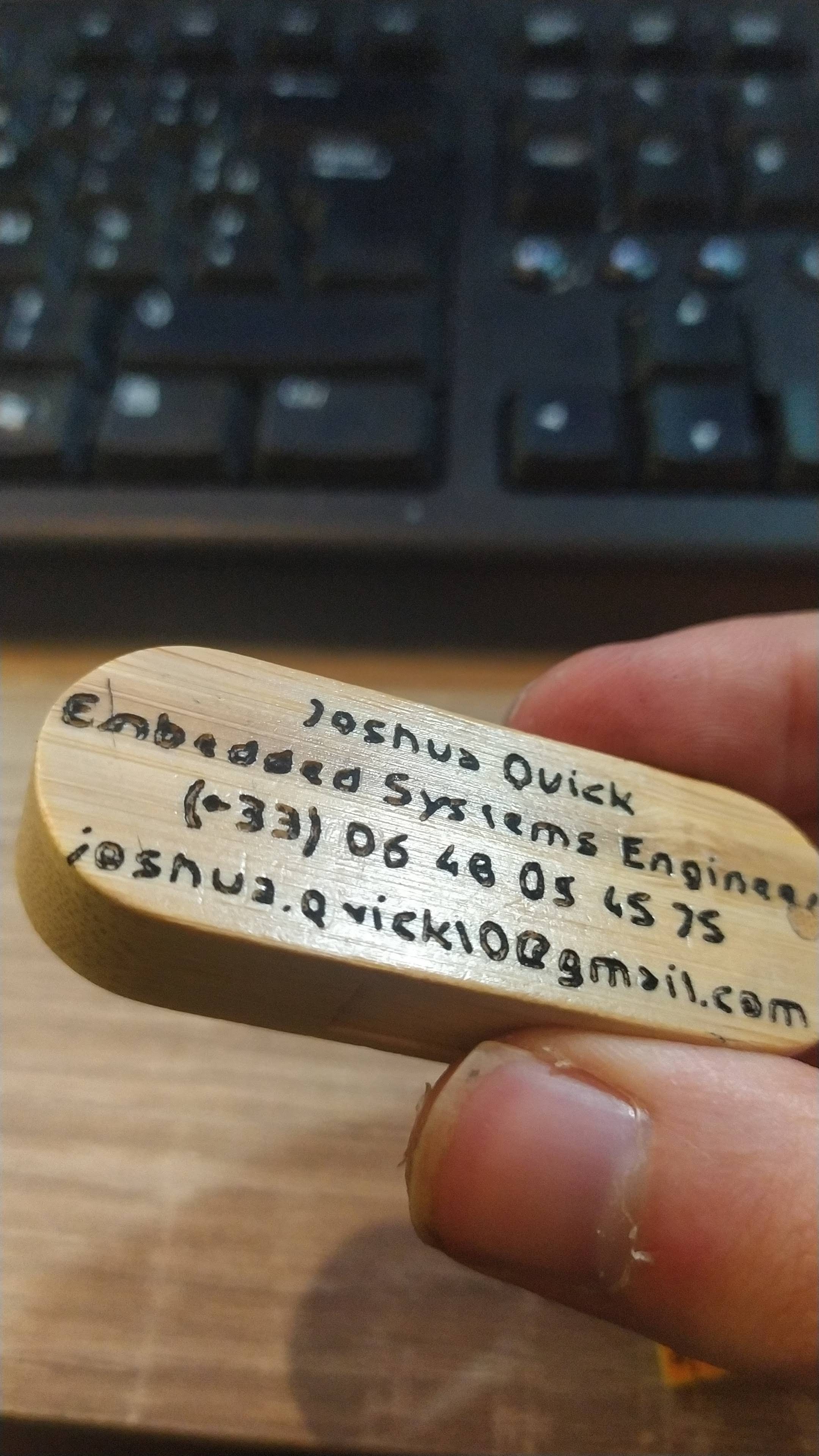 As a first test, I decided to engrave my bamboo usb key. I had to cancel it a few times, and modify the cutout models, but the result is great (the text is polygonal because of me).