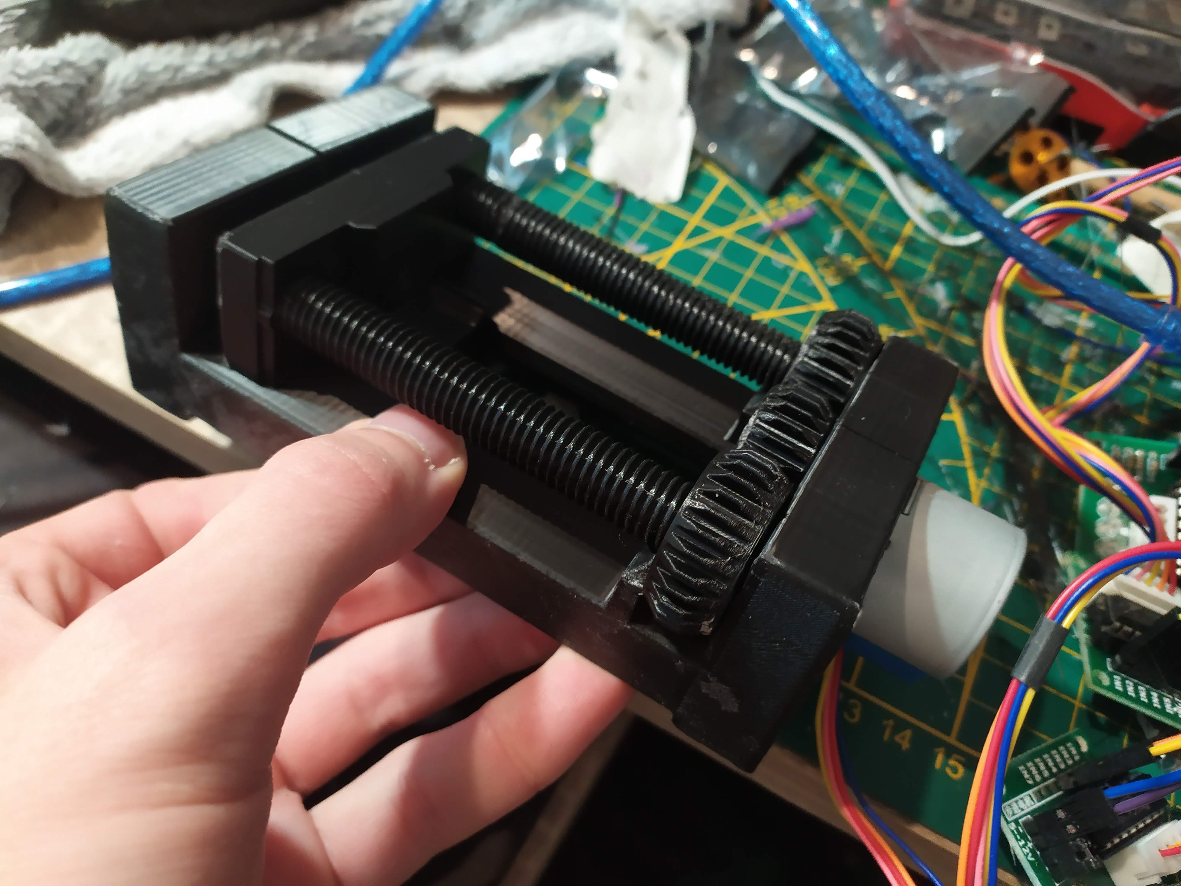 I bought a 12V spindle motor and wanted to build an almost fully 3D printed CNC, based on a 3D printed vice mechanism found on thingiverse, except that I couldn’t get the motor to turn once mounted – the mechanism was simply too tight and in the end the screw spirals snapped. I would like to try again in the future, maybe using my current CNC setup for certain parts.
