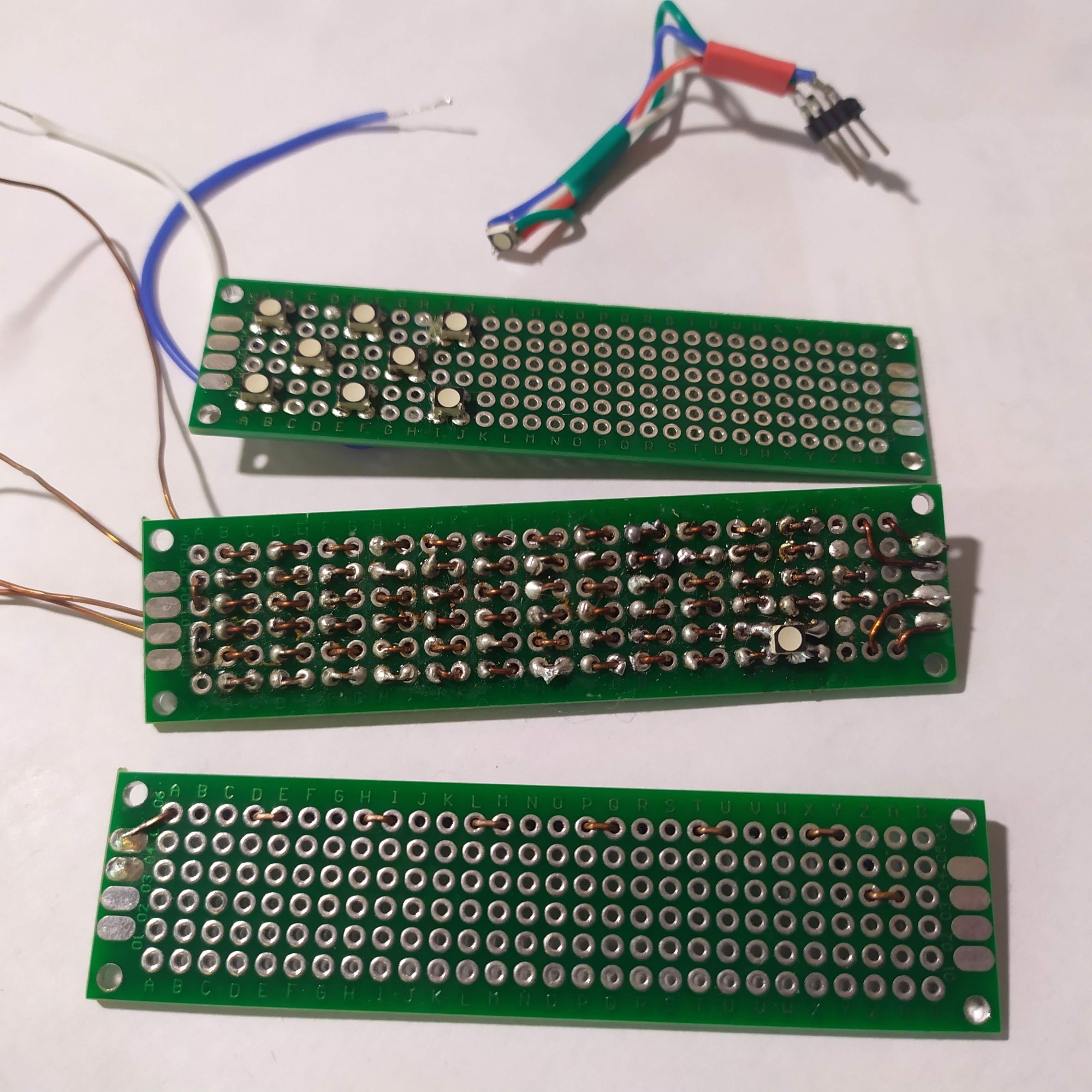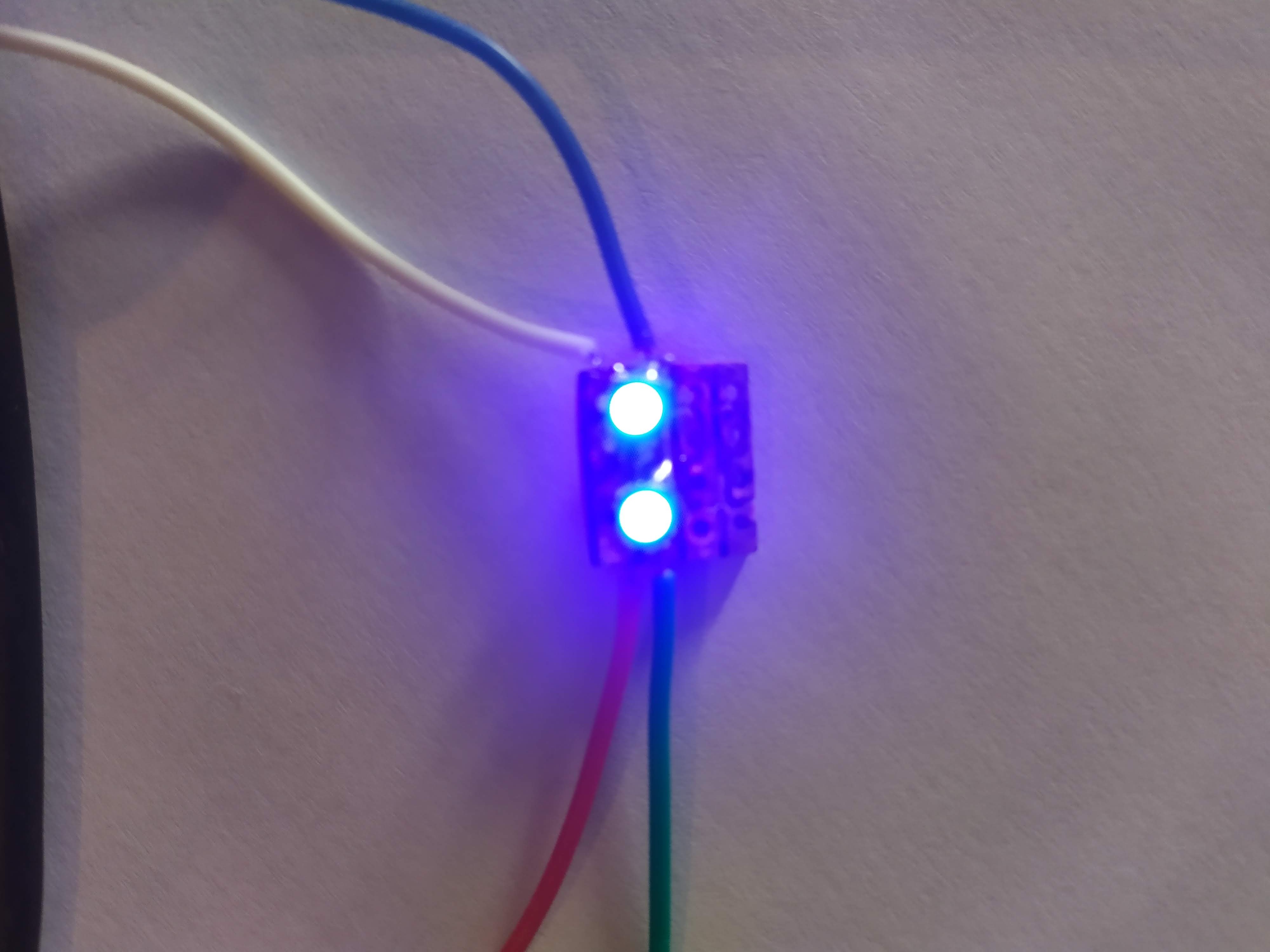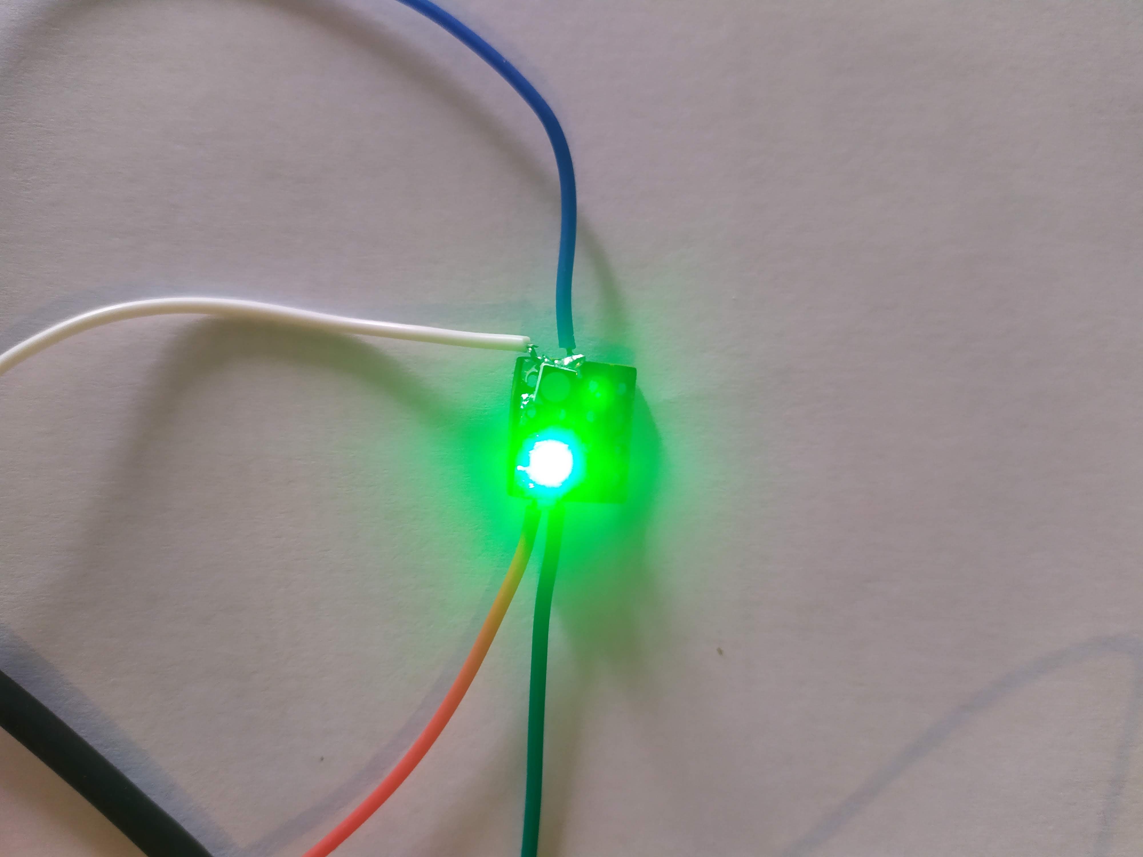 I used prototyping board because I don’t have any copper boards yet; unfortunately, my measurements were slightly off and the trace for the green LED was cut on the line I soldered on, and the other line was unusable. Here are the results :